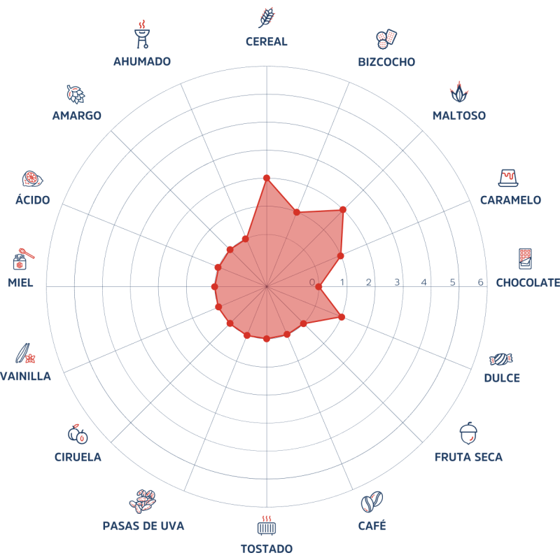 /bolsa (25kg)Esta malta ámbar aporta dulzor, maltosidad y un color ámbar intenso en su receta y un aroma típico a bizcocho y nuez. Además genera una leve acidez y astringencia. Es ideal para cervezas como Amber Ales, Irish Red Ales, Doubles, Trappist Beers y Bocks.